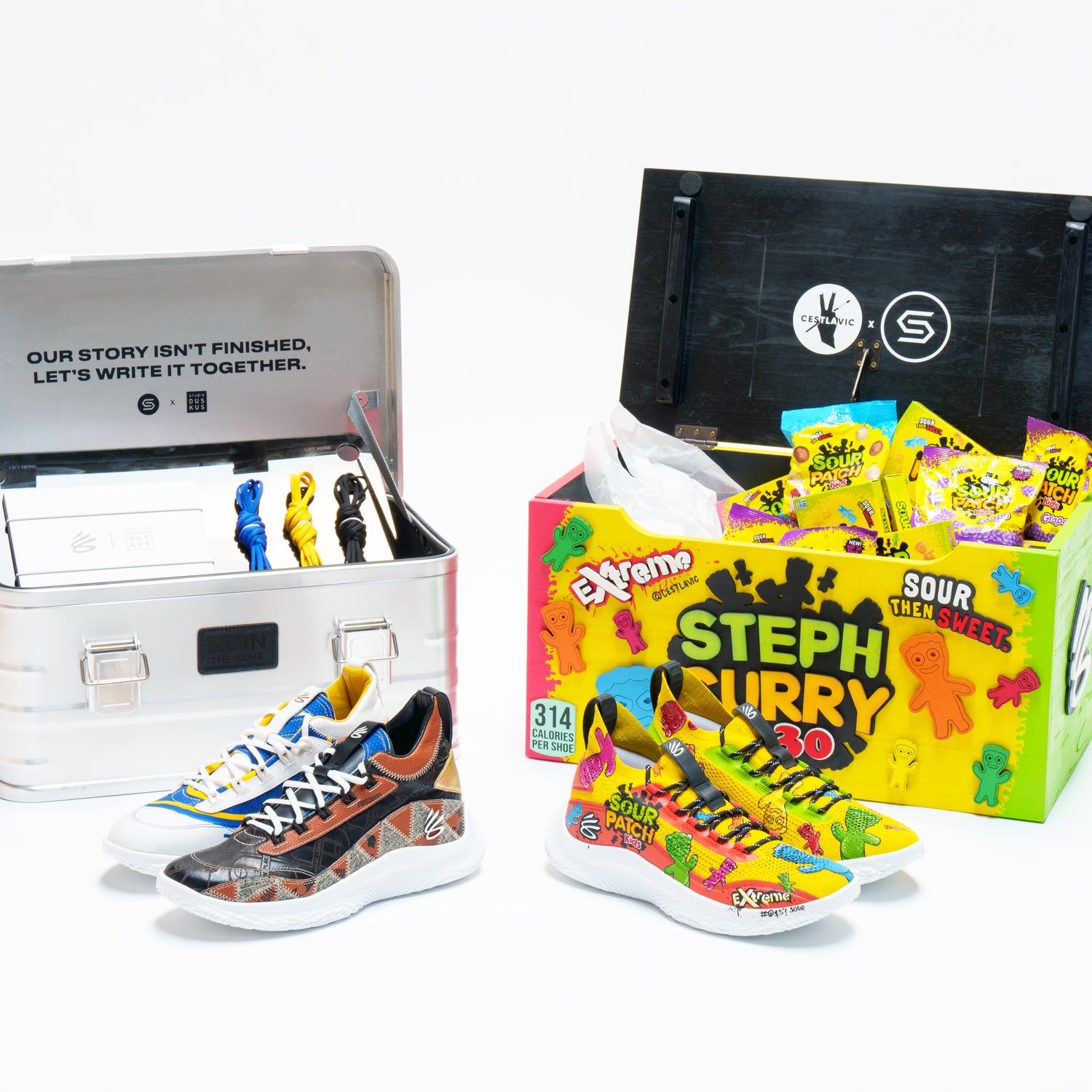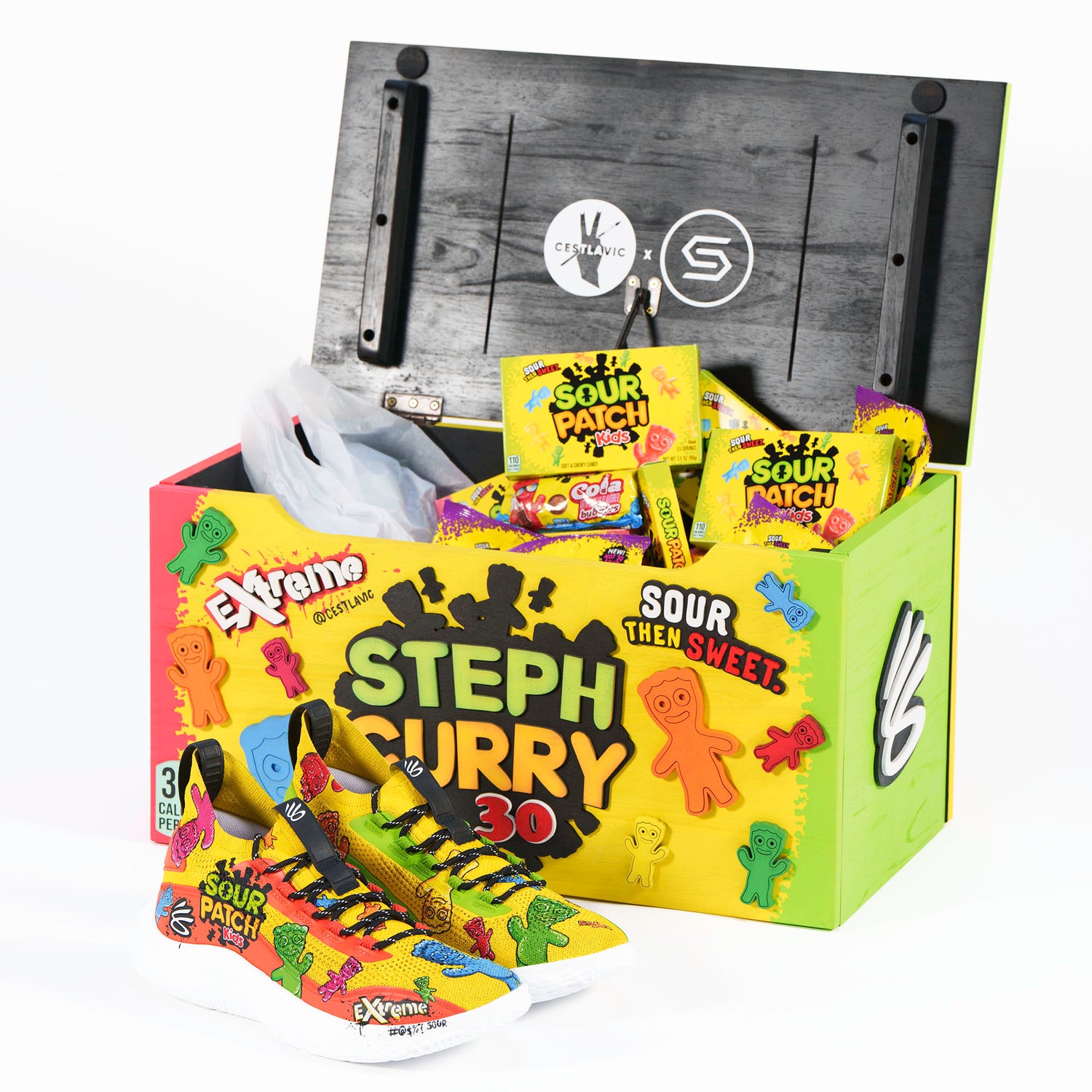 Mismatched sneaker designs are our jam, they bring so much personality to an outfit! We carried this theme through to the giant sneaker box for this project - one side had Extreme SOUR and the other had regular Sour then Sweet SPKs. It was a struggle to part ways with it!