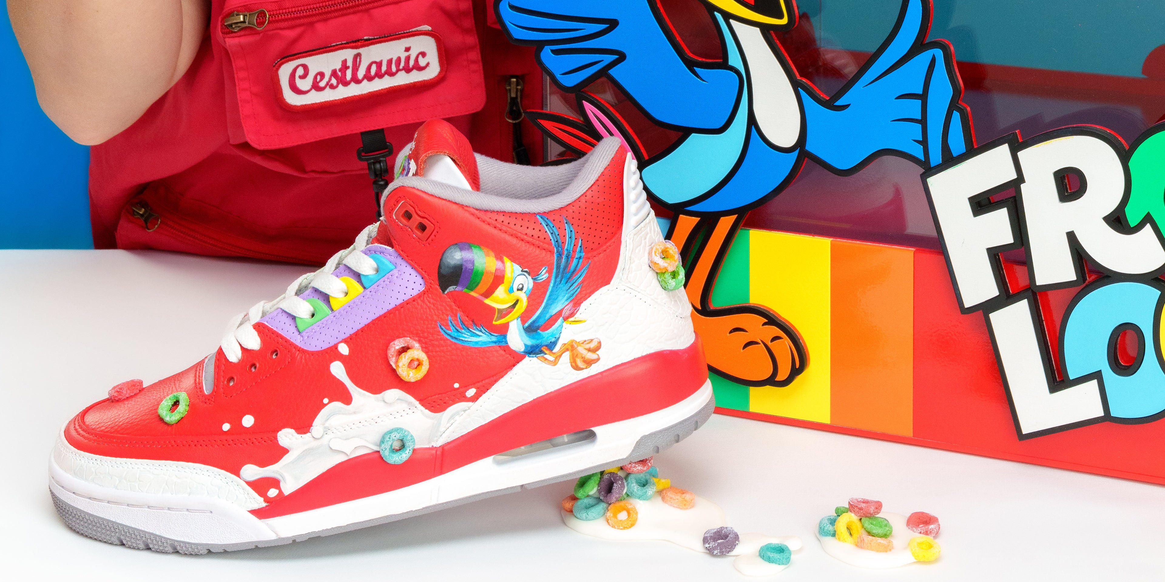 These loopy customs feature 3D cereals sculpted from clay (what??! HECK YEAH) against hand-painted milk splashes. Wait, that's not it! We also create a mini custom cereal spoon hangtag, injected "milk" into the sneaker air bubble, AND infused the sneakers with Froot Loops essence oil so the sneakers smell like the cereal!!! (if only there was a scratch-and-sniff here).