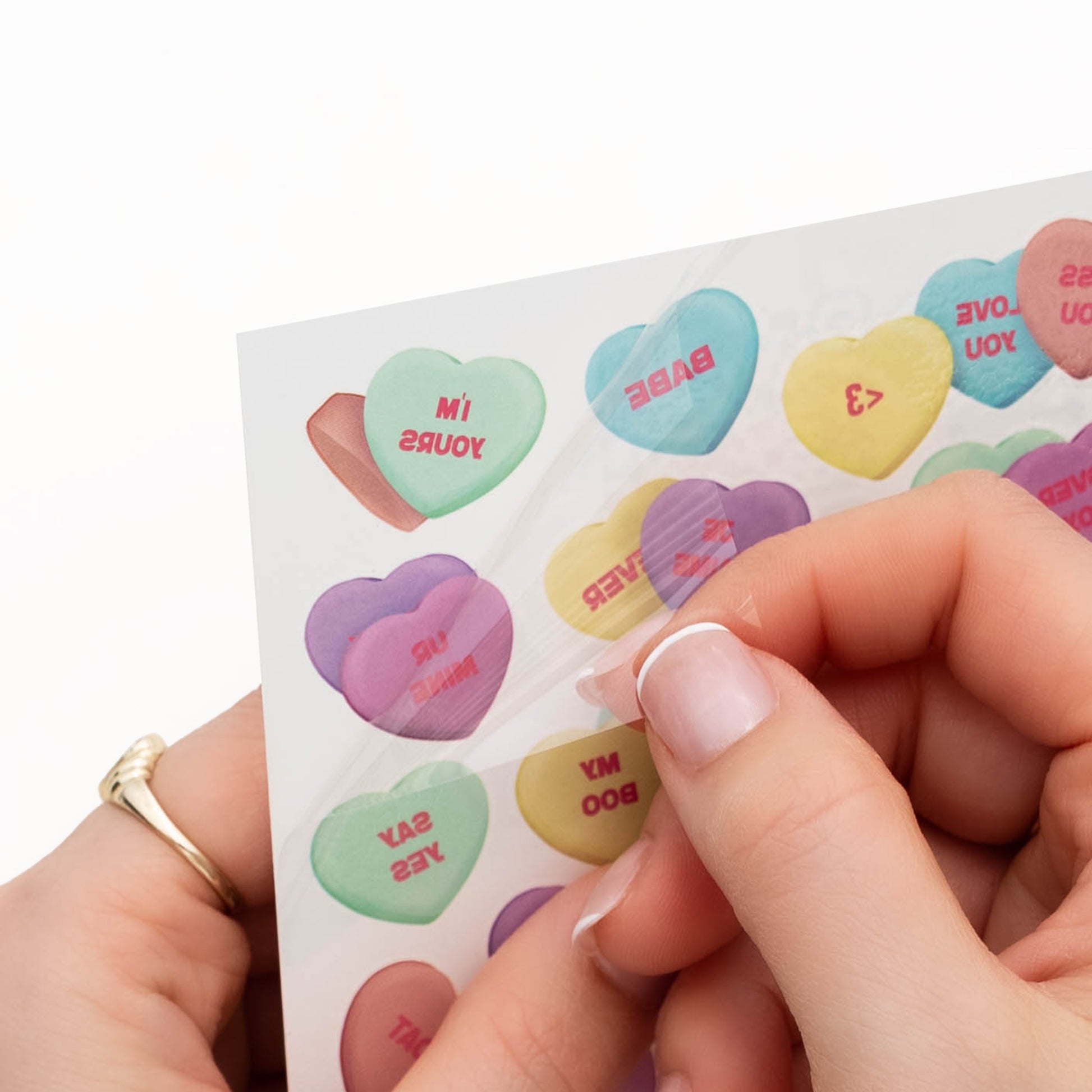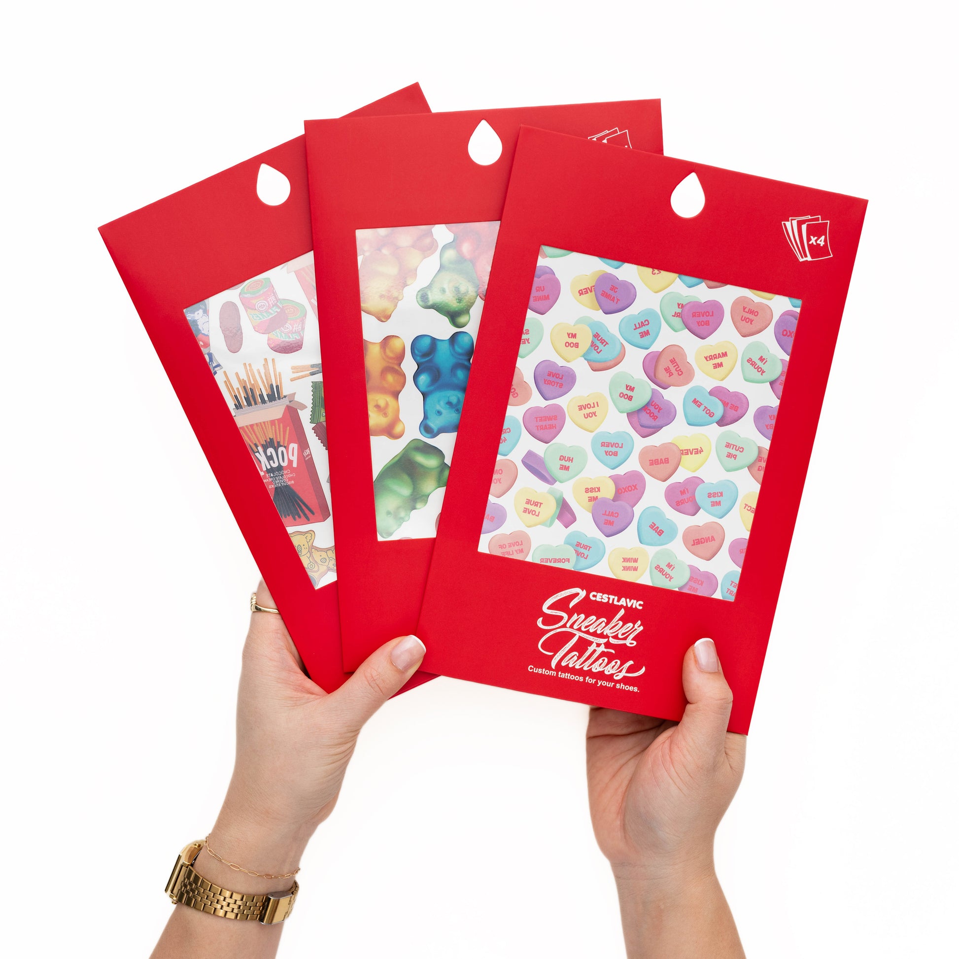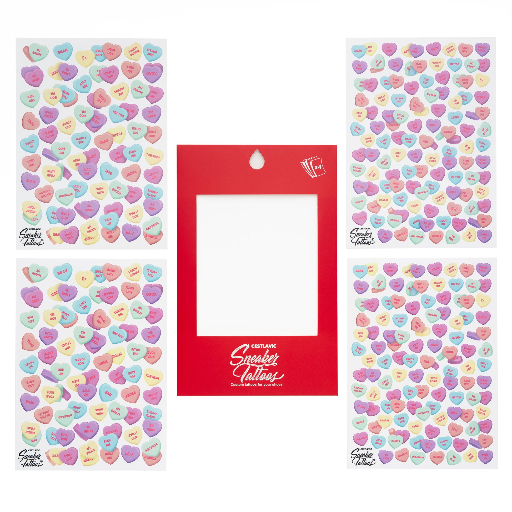 What better way to tell your loved ones (especially if that loved one is yourself) you love them than tattooed conversation hearts you can wear on your sneakers? This set features custom hand-drawn conversation hearts with special messages in two different sizes. Two of the sheets are of larger hearts, two are of smaller hearts. Imagine a matching larger pair and smaller pair! How cute would that be! Anyways, design away, the possibilities are unlimited.